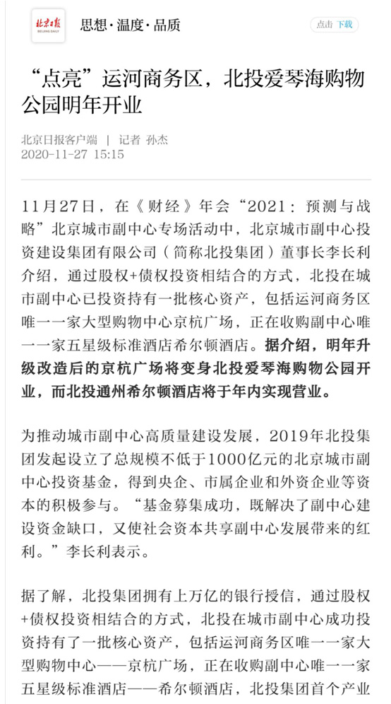 在高质量完成重大项目的同时,自2019年起,北投集团高起点打造金融板块,以旗下北投投资公司为平台,以基金为引领,形成了基金、担保、保理、供应链管理的业务布局,实现了金融业务与实体经营“双轮驱动”的发展格局,改善提升了通州区营商环境,助力了城市副中心高质量建设发展,发挥了副中心平台企业的引领作用。