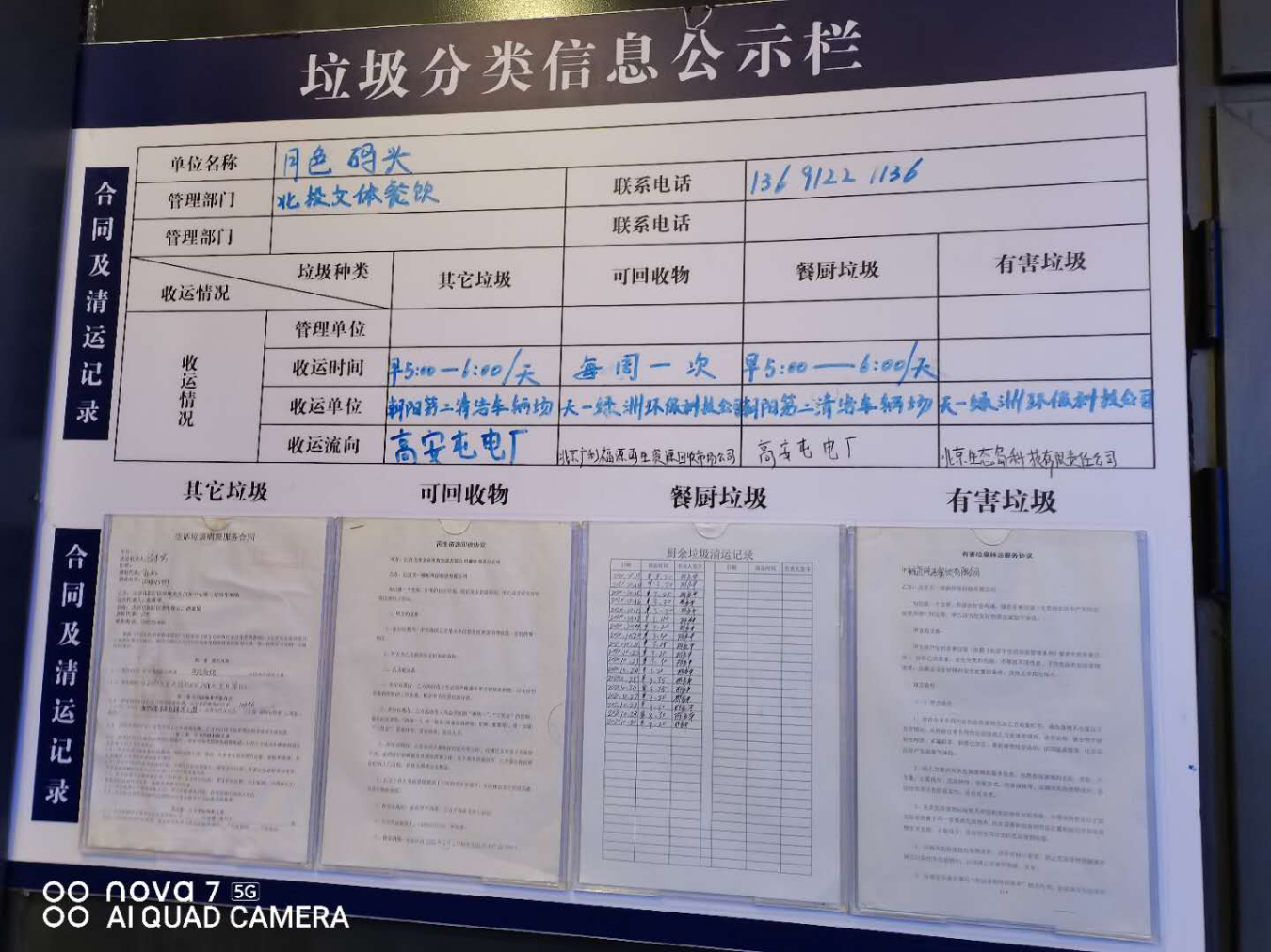 在奥林匹克中心区月色码头,集团所属北投文旅公司通过设置分类垃圾桶,并在垃圾桶上贴“可回收”和“不可回收”“厨余垃圾”等标识,积极引导就餐顾客准确投放垃圾。