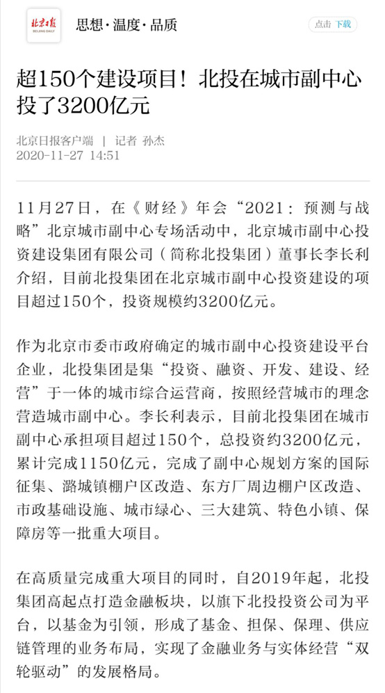目前,北投集团在城市副中心承担项目超过150个,总投资约3200亿元,完成了副中心规划方案的国际征集、潞城镇棚户区改造、东方厂周边棚户区改造、市政基础设施、城市绿心、三大建筑、特色小镇、保障房等一批重大项目。